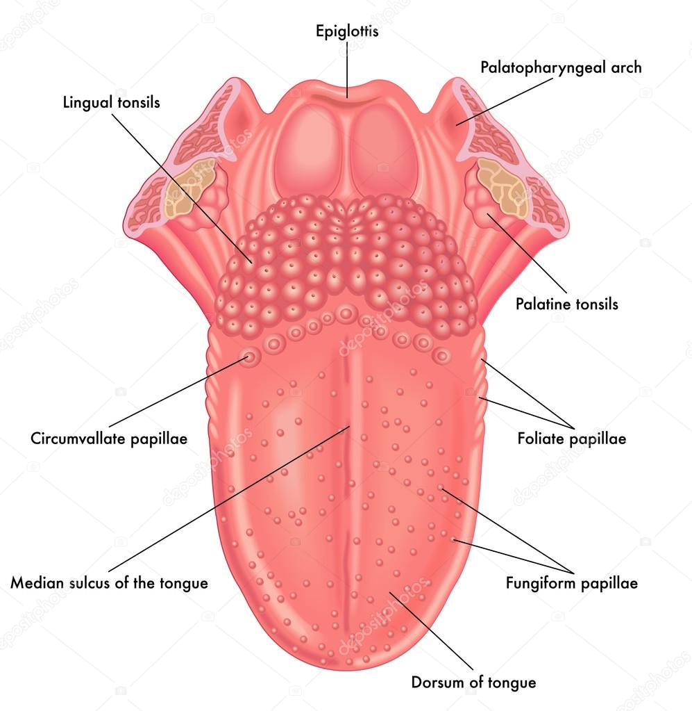 Tongue is a muscular organ situated at the floor of the mouth.The tongue is covered with moist, pink tissue called mucosa.Tiny bumps called papillae give the tongue its rough texture. Thousands of taste buds cover the surfaces of the papillae.